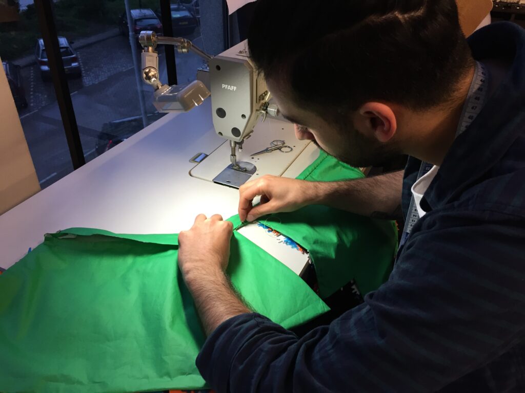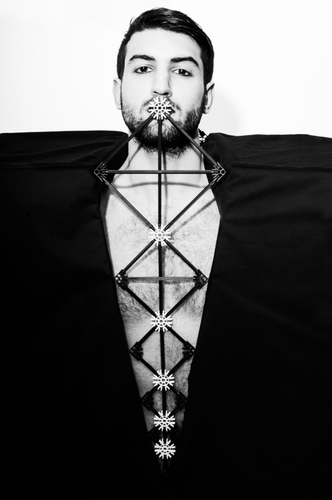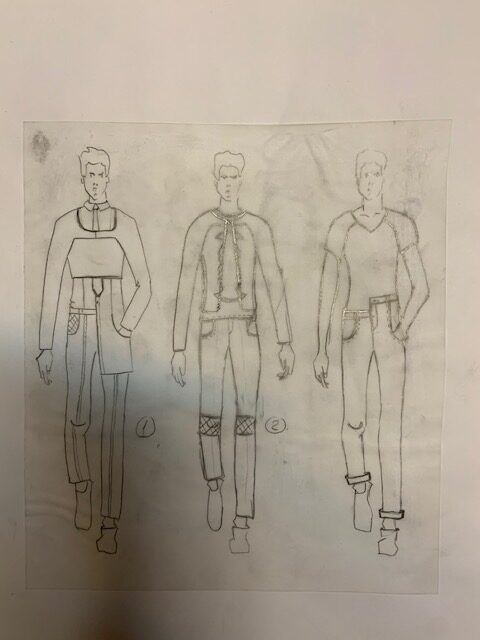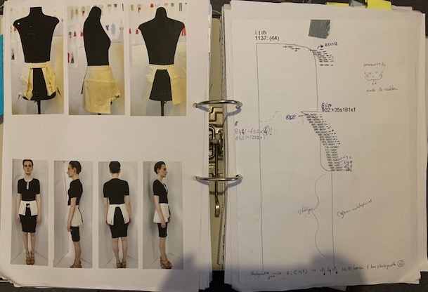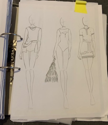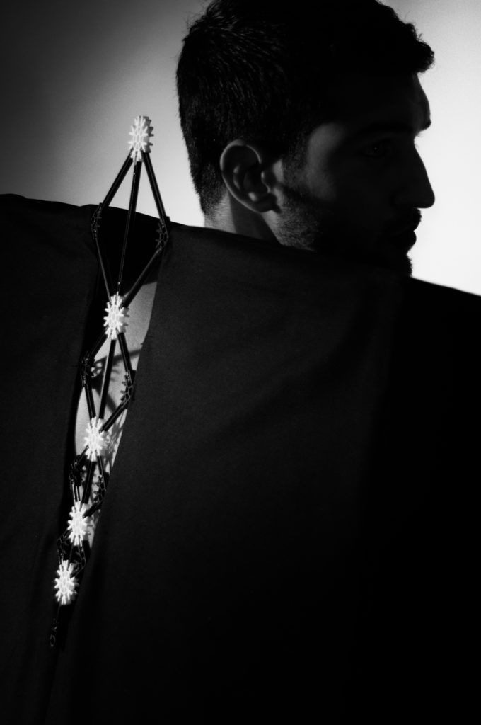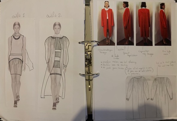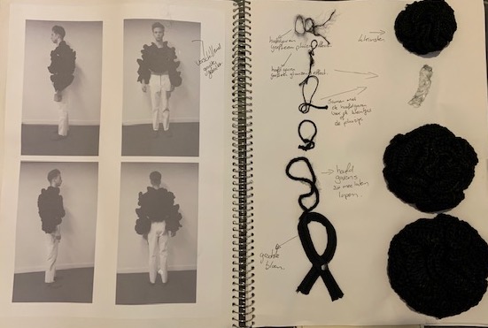 Een duistere wereld met een vleugje rood, de kleur die kracht uitstraalt, die houvast geeft. De vormen zijn ongestructureerd en grillig, vormen waar je je achter kan verschuilen. De materialen zijn heel gevarieerd, er zitten veel verschillende materialen in een kledingstuk, dit geeft de verwarring van de duisternis weer.